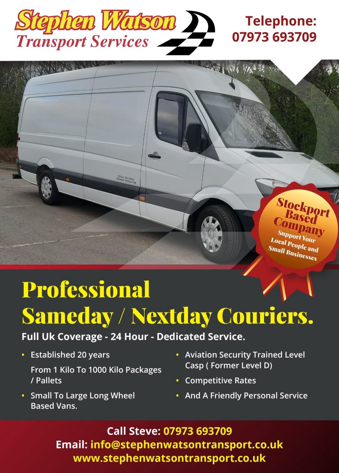 We are a Stockport based friendly courier service , we have been operating since 1996 25 years . we can offer same day or next day delivery service all over the UK and Ireland 24hours a day 7 days a week .from single document to pallets or 4.2 meter lengths.